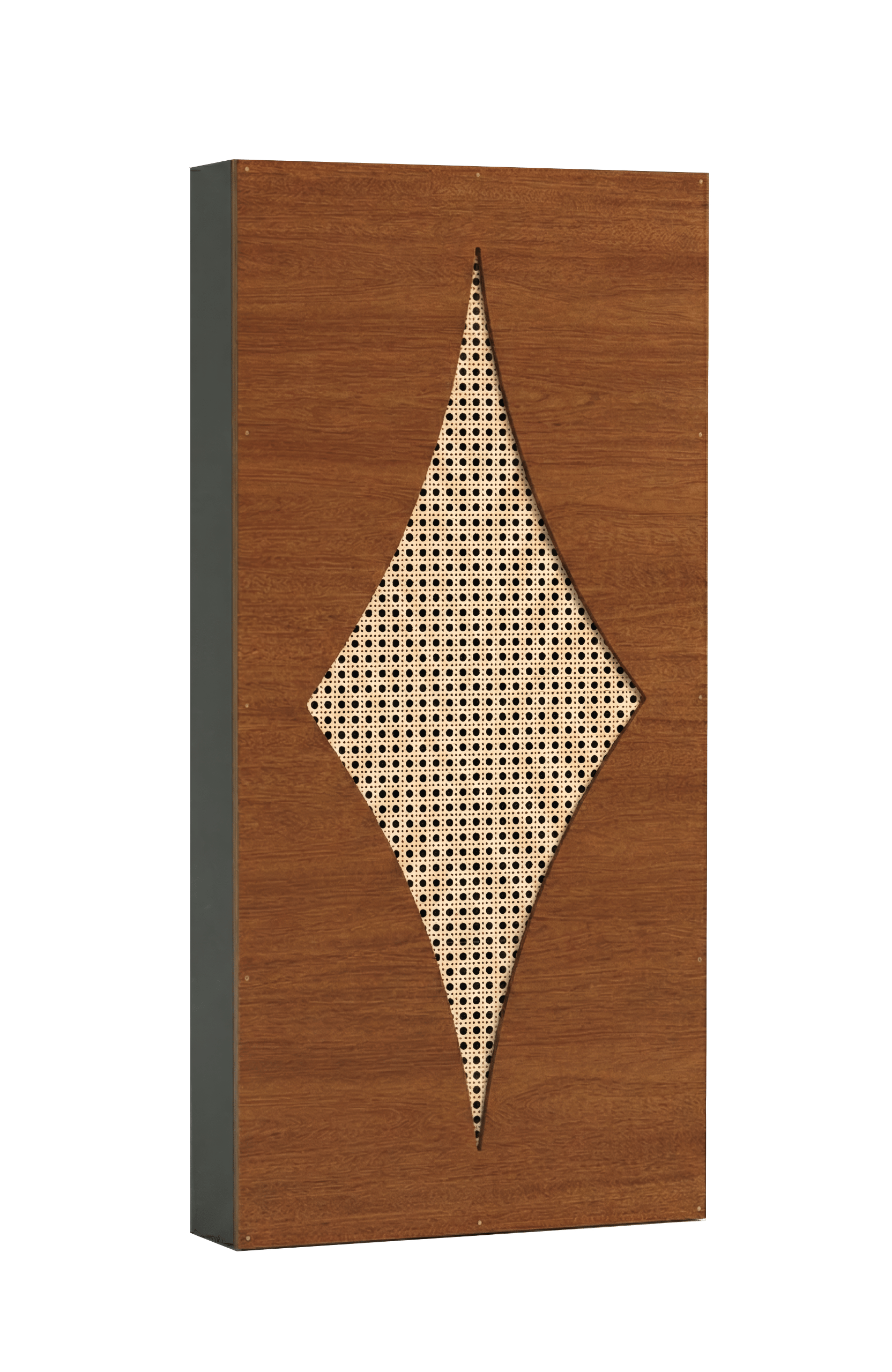 AbFuser Rattan Casino is a hybrid acoustic panel combining broadband absorption and sound diffusion — with natural rattan on the front. The rattan webbing in the Casino pattern (regular, dense weave) gives it a warm character associated with boho aesthetics and the retro-tropical design of the 1960s and 70s. Available in two colour finishes — Brown and Venge — and two thicknesses.
