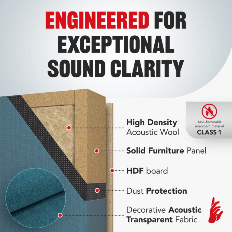 Top-grade acoustic wool with ~80 kg/m³ density, precisely cut to the panel size. Non-combustible class A1 material with a hygiene certificate.