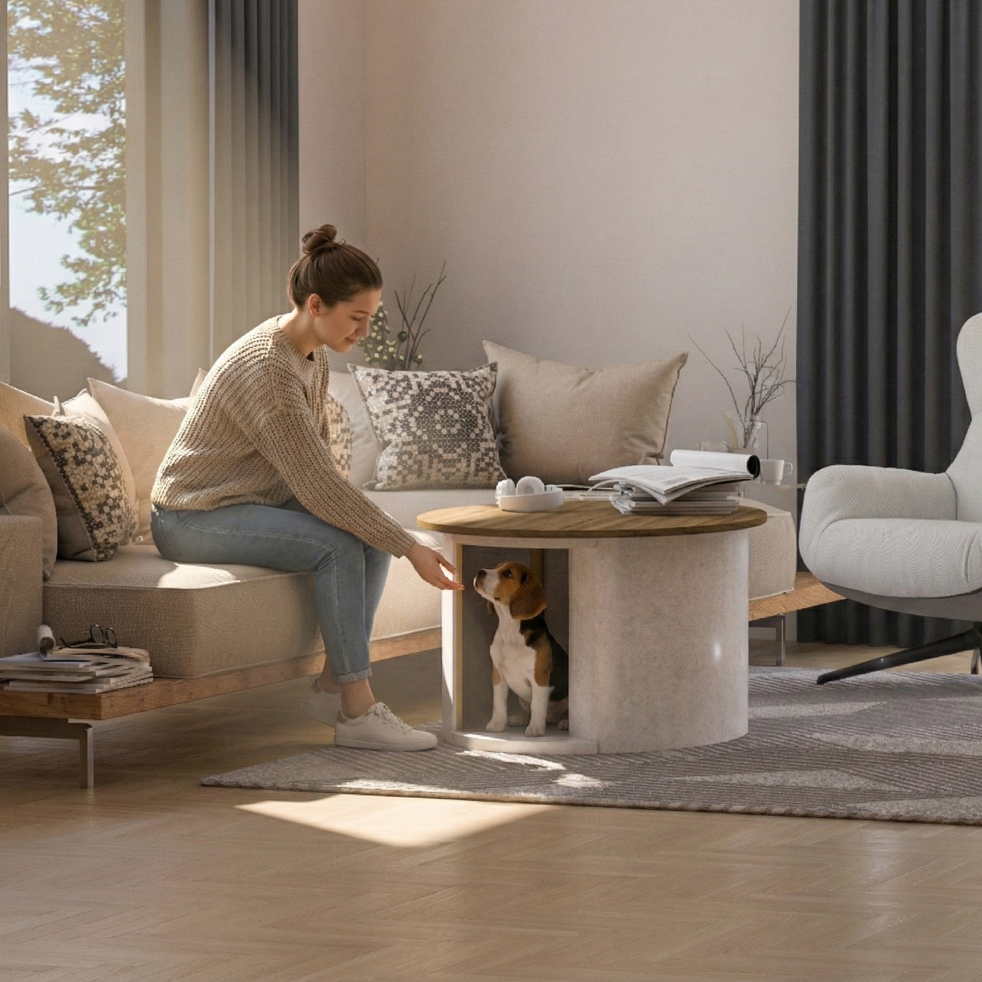 Elegant furniture combining a comfortable pet shelter with a functional coffee table in a modern style.