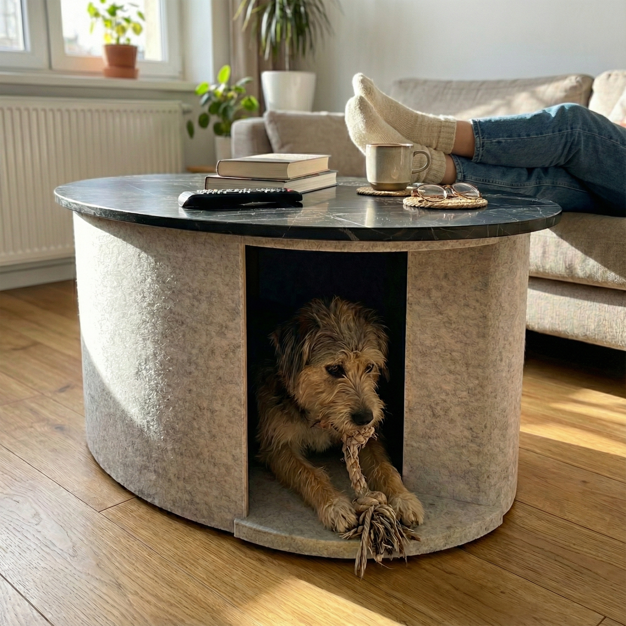The Acoustic Den is an innovative pet furniture piece that combines a sound-dampening hideaway with an elegant coffee table. It effectively muffles stressful noises such as fireworks, thunderstorms, or renovation sounds, giving your pet calm and a sense of security. The interior is lined with soft acoustic felt that works like a cosy cocoon, significantly reducing the amount of noise that reaches your pet. Its ergonomic, elliptical shape supports a comfortable resting position, while a practical Velcro fastening system lets you remove the upholstery easily for quick cleaning and better hygiene. The product comes in three sizes (S up to 7 kg, M up to 15 kg, L up to 25 kg) and four tabletop finishes—dark/light brown and dark/light marble—so you can perfectly match it to your pet’s needs and your interior style.