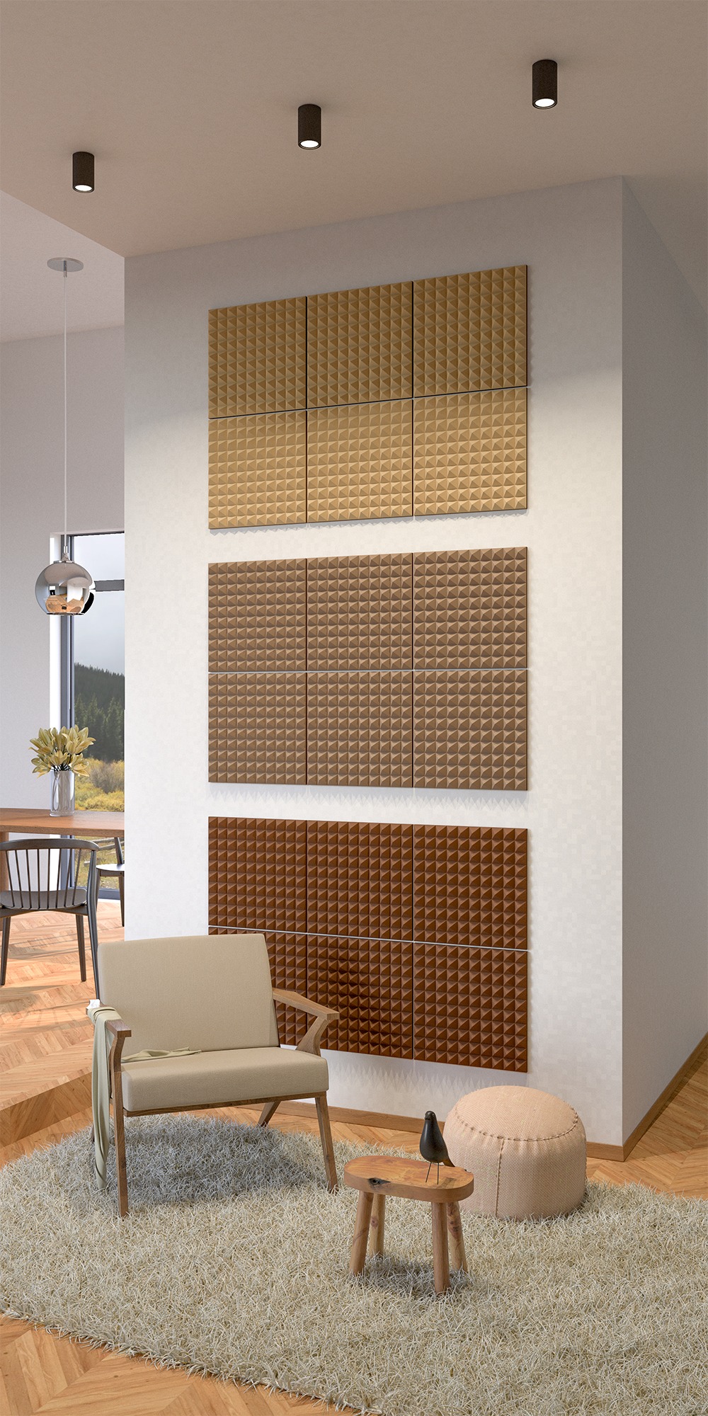 Absorbers come in a wide palette of 25 colors. Compared to acoustic foams, installation is simpler and less invasive. They are hung like a picture using two dowels included in the set. Unlike foams, they do not need to be glued to the wall — which means they can be removed without damaging the wall or the product.