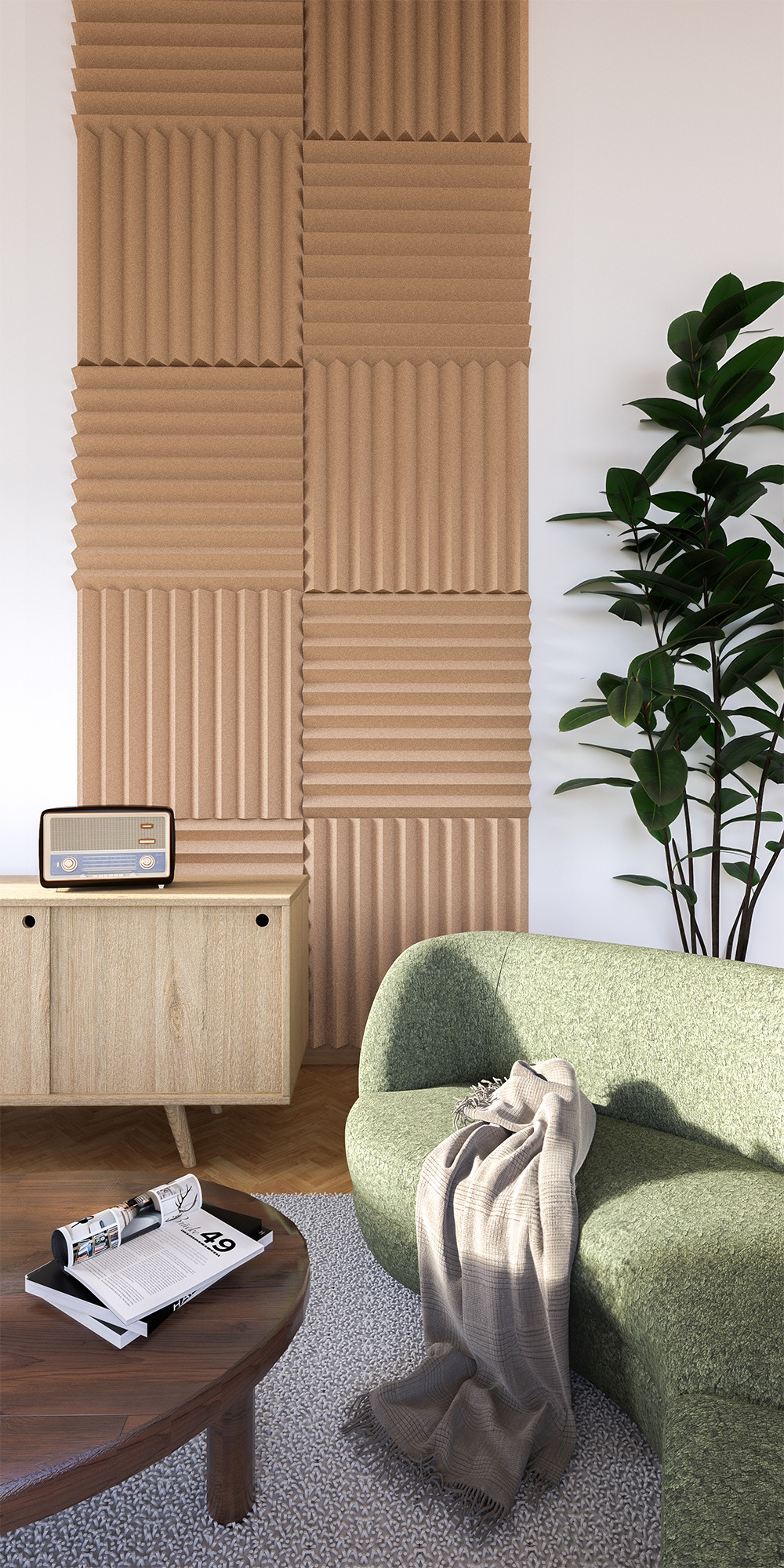 The special construction of the Addictive Sound broadband absorber optimizes its acoustic performance. A low-weight, acoustically transparent fabric is used, which is practically neutral to sound waves. Beneath the main fabric layer is an additional inner layer to prevent any dusting. The rear of the panel is finished with a thin furniture-grade board, which enhances low-frequency absorption. Acoustic waves that pass through the wool hit the wooden board, causing additional wave bending. The reflected sound must then travel back through the wool and board, increasing absorption. If an air gap is added between the wall and the panel, performance is even further improved. The rear board significantly enhances the panel’s performance compared to absorber panels without a backing. The solid furniture-grade construction also provides durability and an appealing visual appearance.