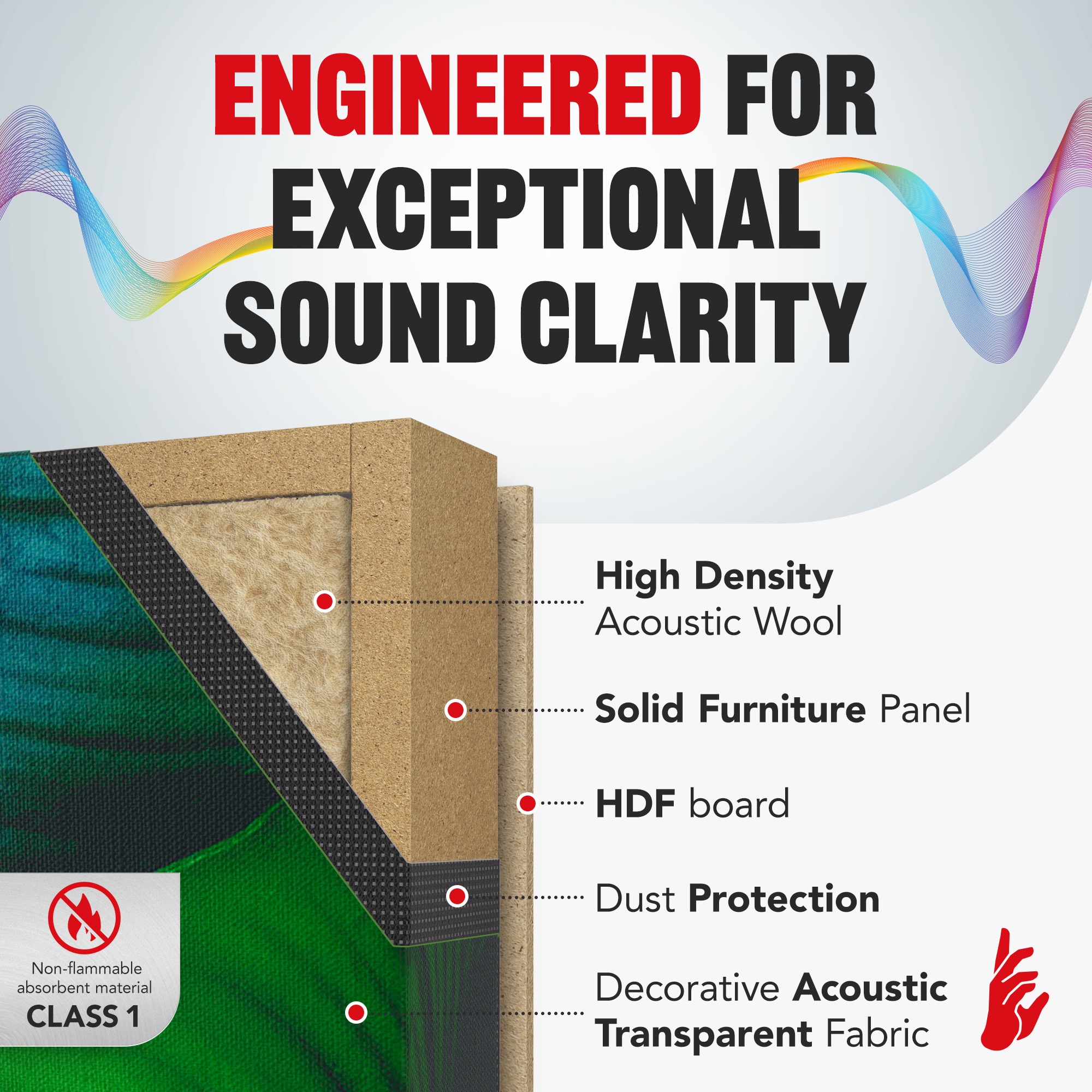 Top-grade acoustic wool with ~80 kg/m³ density, precisely cut to the panel size. Non-combustible class A1 material with a hygiene certificate.
