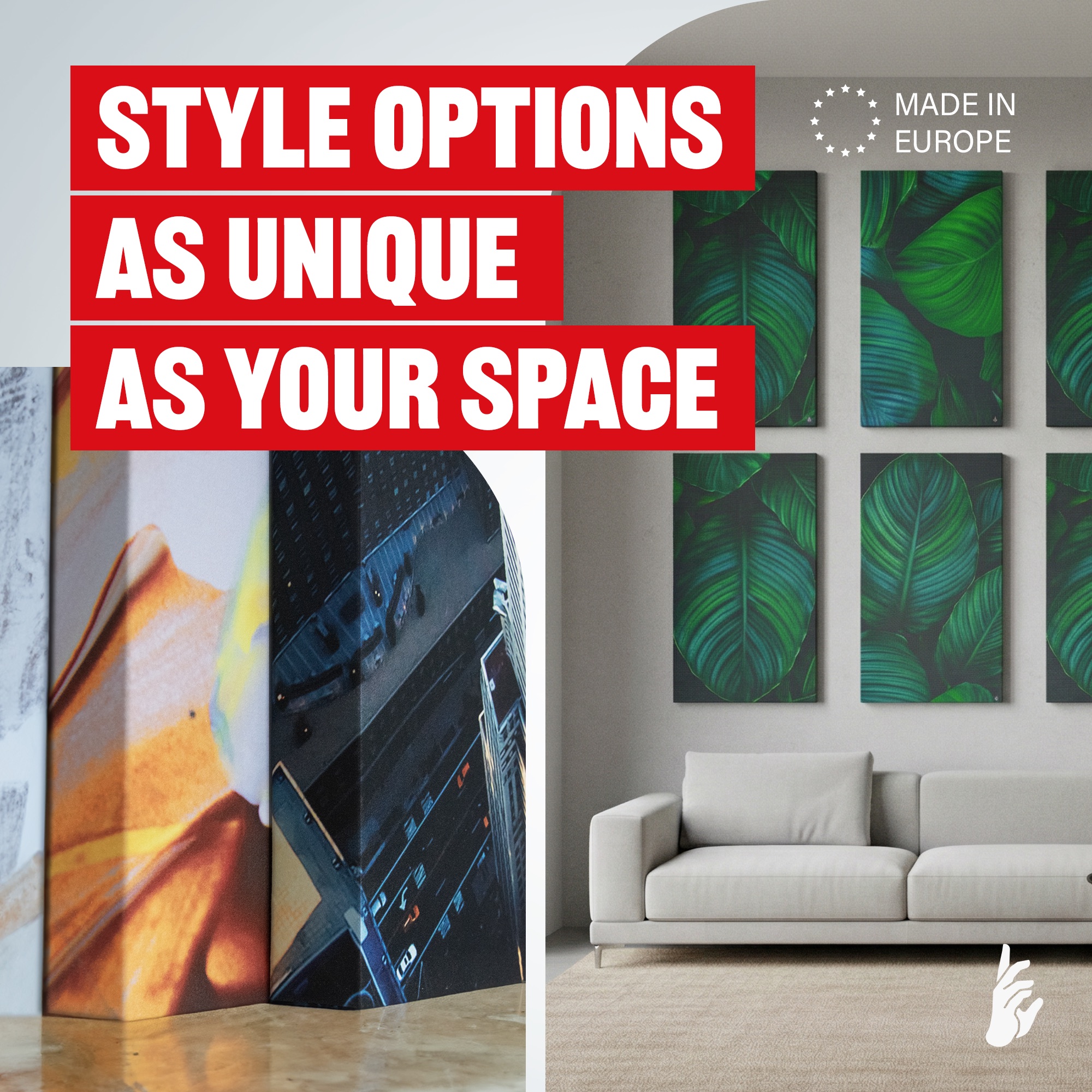 Choose from 45 unique patterns—from abstract to nature. Each graphic is applied using a dedicated print technology on acoustic fabric, creating a functional decoration.