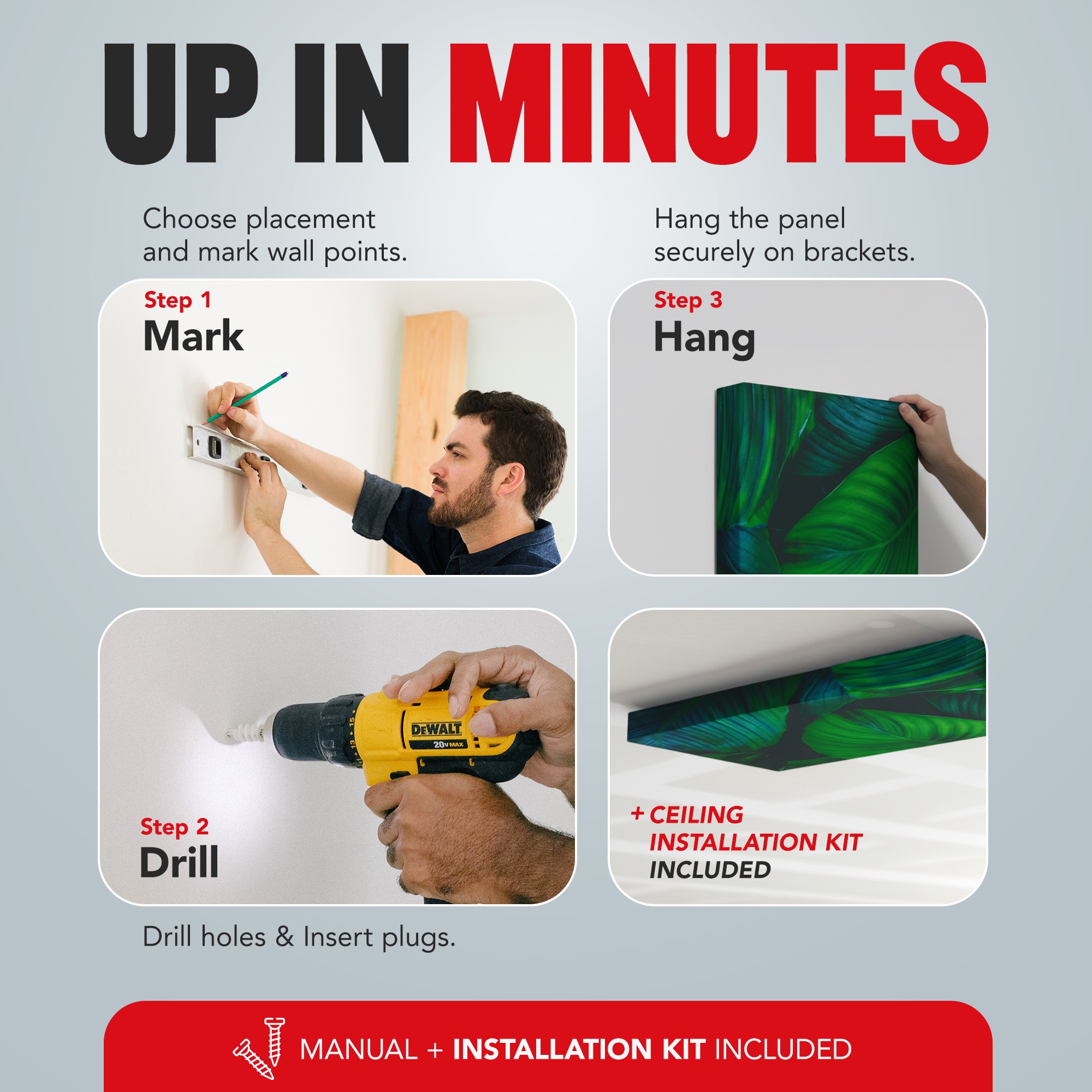 You receive a complete installation kit to mount the panel where you want: on a wall or on the ceiling (choose the option at checkout).