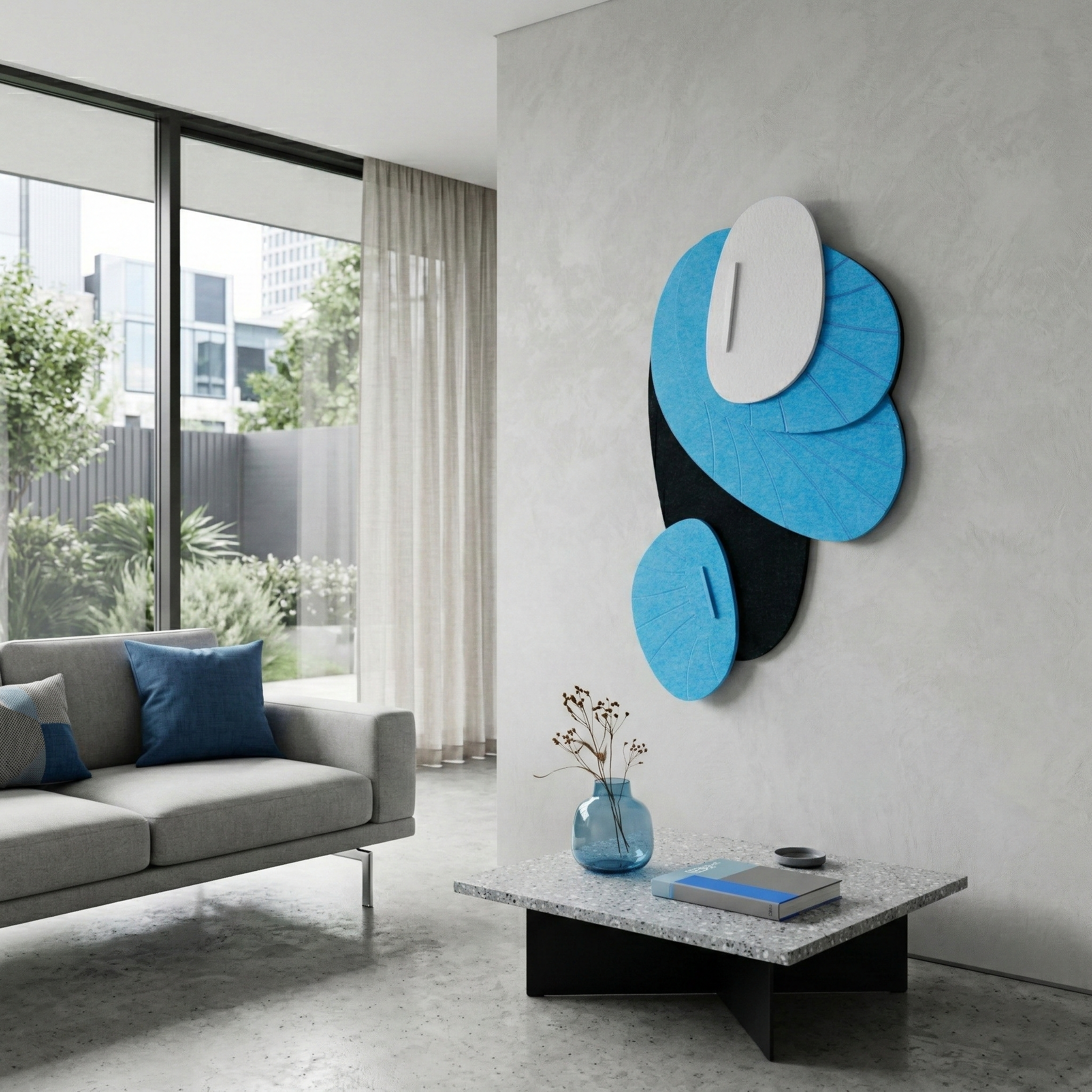 Resonance Bloom is a decorative acoustic panel made from certified Pro.Felt 9mm, creating a spectacular 3D effect on the wall. It effectively reduces reverberation and echo while serving as a modern interior decoration. The panel features factory-applied adhesive strips and includes mounting dowels for reinforced fixing. Seven unique colour variants let you match any style.