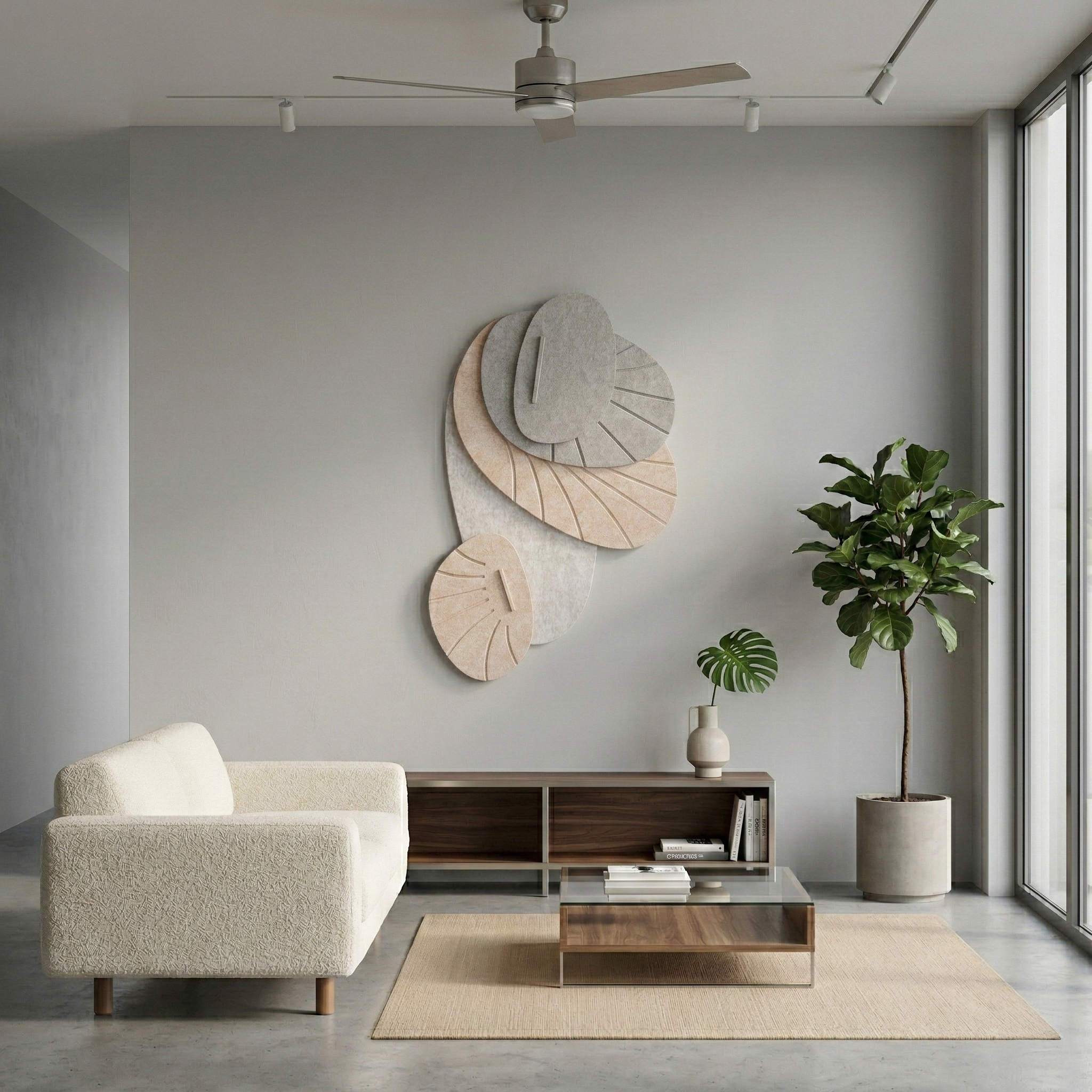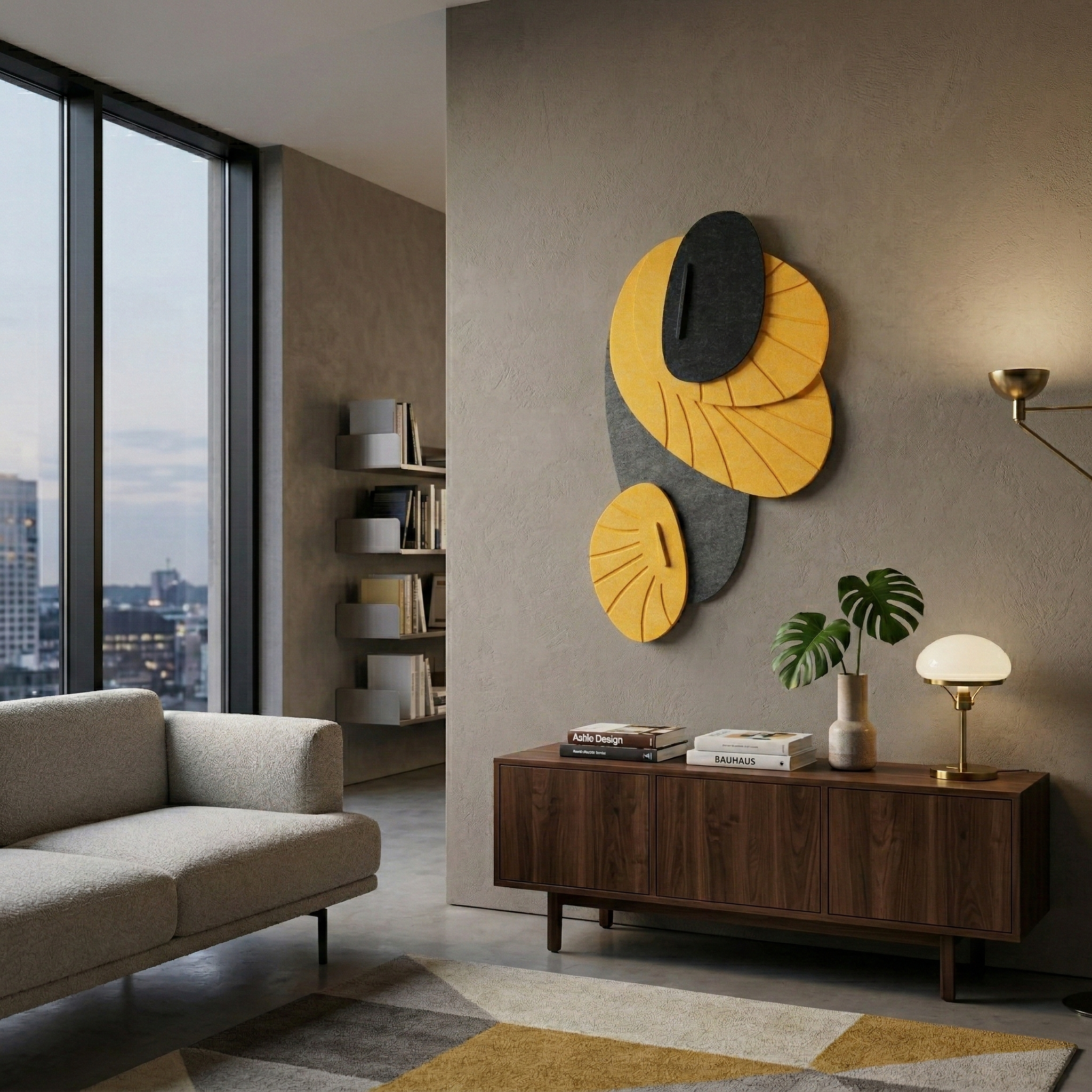 A unique three-dimensional structure made from acoustic felt creates a striking interplay of light and shadow on the wall. Geometric elements add depth and character to the interior, combining decorative and acoustic functions.